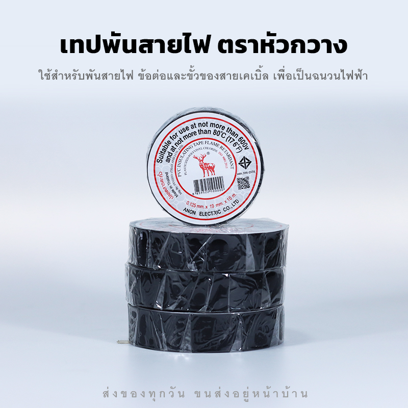 เทปพันสายไฟตราหัวกวาง สีดำ เนื้อเหนียว ติดแน่น คุณภาพสูง ทนอุนหภูมิและสภาพอากาศ ใช้สำหรับพันสายไฟ ข้อต่อและขั้วของสายเคเบิ้ล เพื่อเป็นฉนวนไฟฟ้า