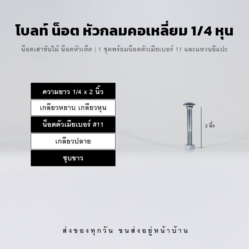 4.บรรจุ : โบลท์หัวกลมคอเหลี่ยม 1/4 x 2 นิ้ว น็อตตัวเมียเบอร์ 11 และแหวนอีแปะ