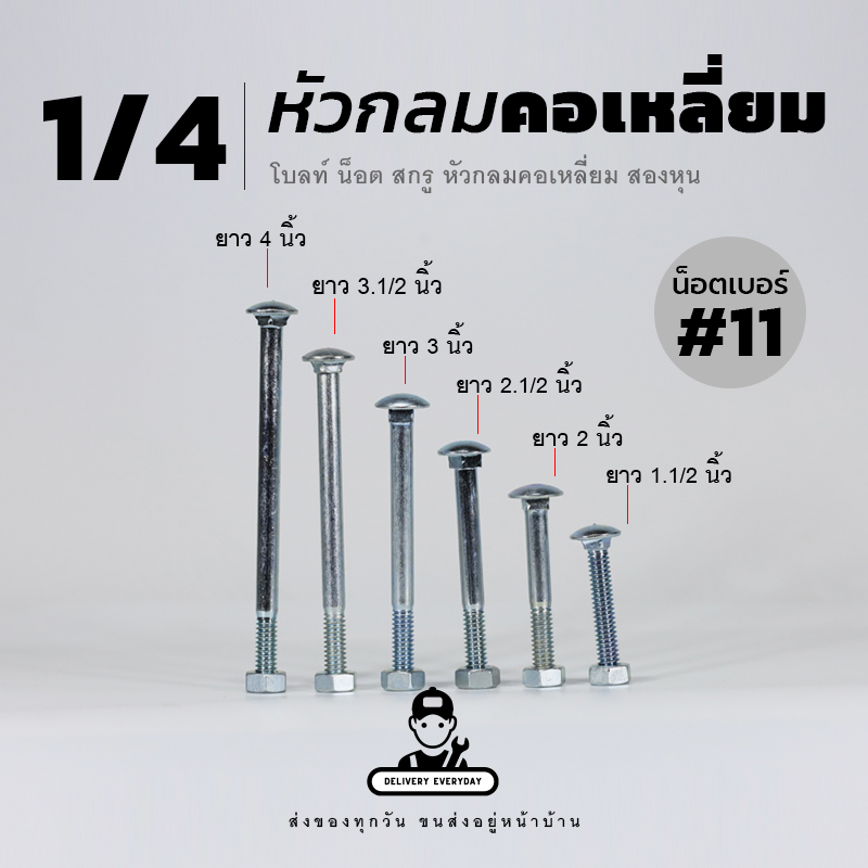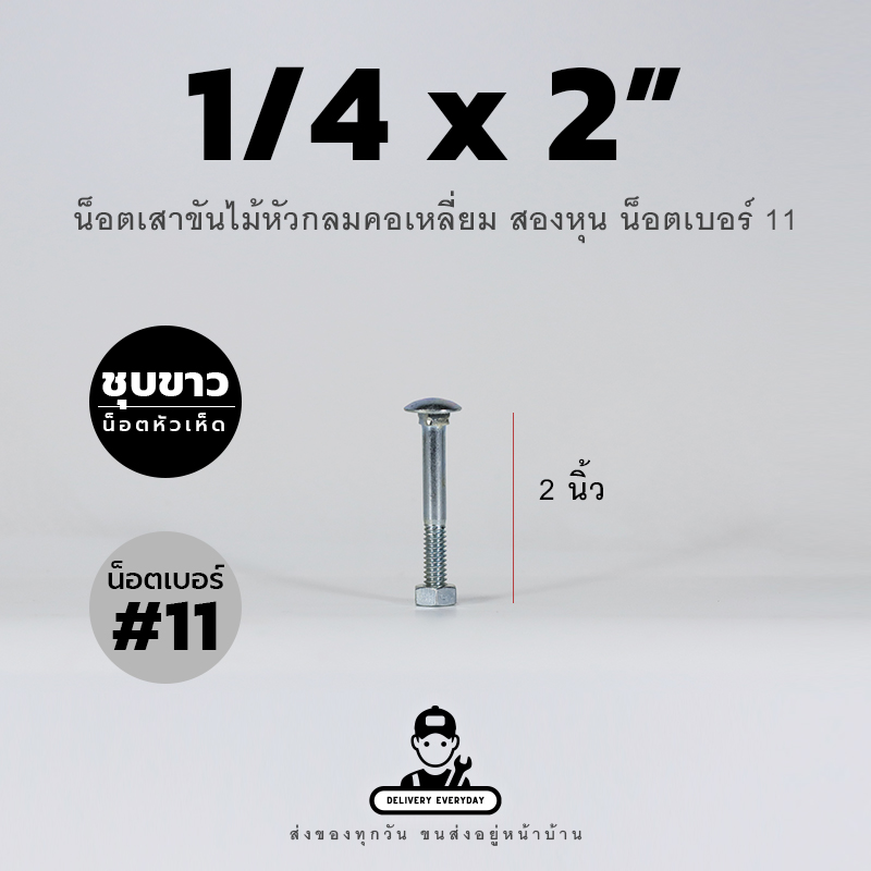 6.ใน 1 ชุดประกอบด้วย โบลท์หัวกลมคอเหลี่ยม ยาว 2 นิ้ว น็อตตัวเมียเบอร์ 11 และแหวนอีแปะ