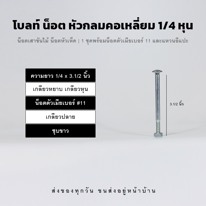 4.บรรจุ : โบลท์หัวกลมคอเหลี่ยม 1/4 x 3.1/2 นิ้ว น็อตตัวเมียเบอร์ 11 และแหวนอีแปะ