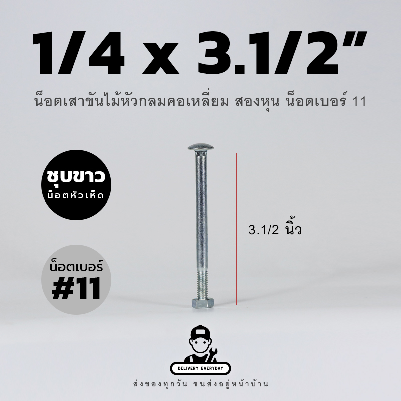 น็อตเสาขันไม้หัวกลมคอเหลี่ยมชุบขาวขนาดสองหุน ยาว 3.1/2 นิ้ว น็อตเบอร์ 11