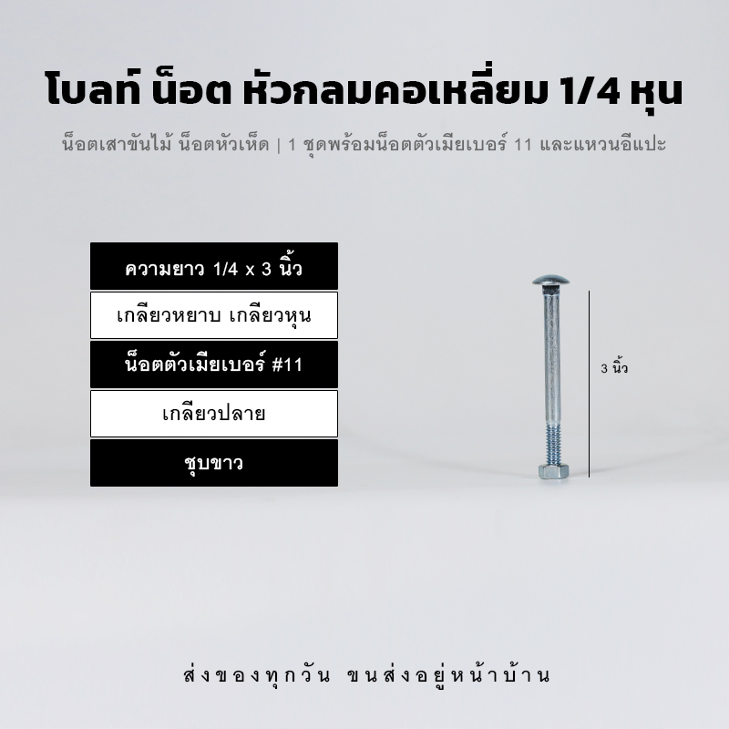 โบลท์เสาขันไม้หัวกลมคอเหลี่ยม สองหุน ความยาว 3 นิ้วเกลียวปลาย ชุบขาว อย่างดี แข็งแรงทนทาน เหมาะใช้ยึดวัสดุ เหล็ก เสาปูน เสาไม้