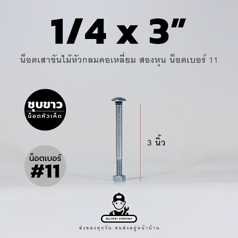 6.ใน 1 ชุดประกอบด้วย โบลท์หัวกลมคอเหลี่ยม ยาว 3 นิ้ว น็อตตัวเมียเบอร์ 11 และแหวนอีแปะ
