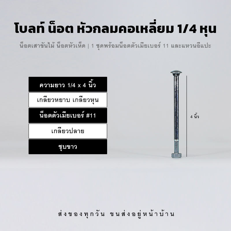 4.บรรจุ : โบลท์หัวกลมคอเหลี่ยม 1/4 x 4 นิ้ว น็อตตัวเมียเบอร์ 11 และแหวนอีแปะ