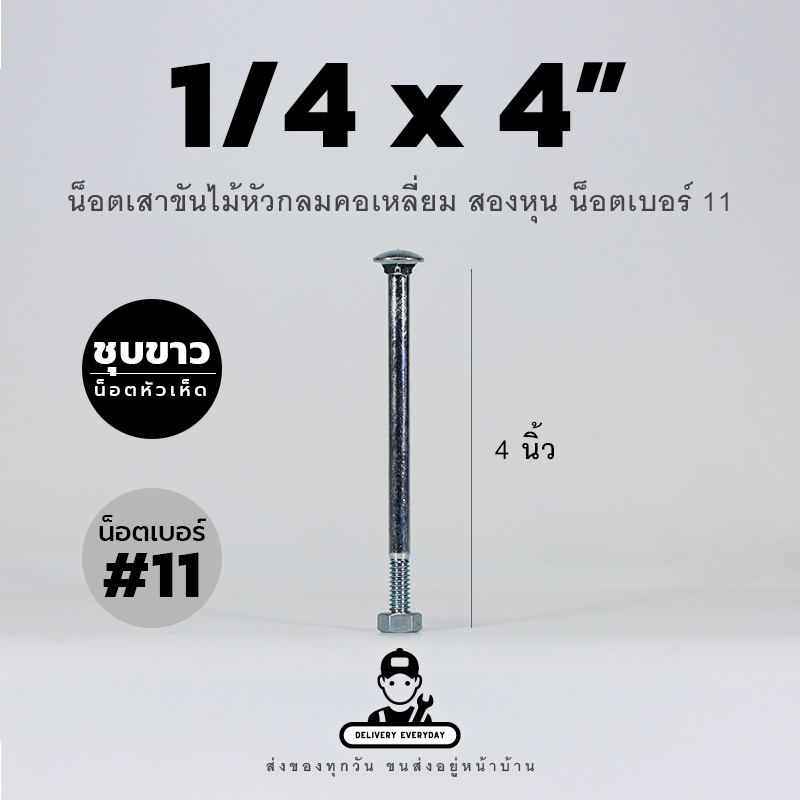 6.ใน 1 ชุดประกอบด้วย โบลท์หัวกลมคอเหลี่ยม ยาว 4 นิ้ว น็อตตัวเมียเบอร์ 11 และแหวนอีแปะ