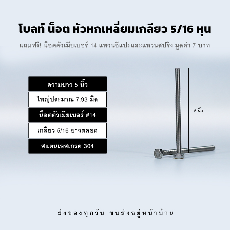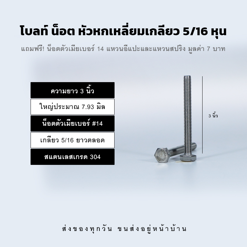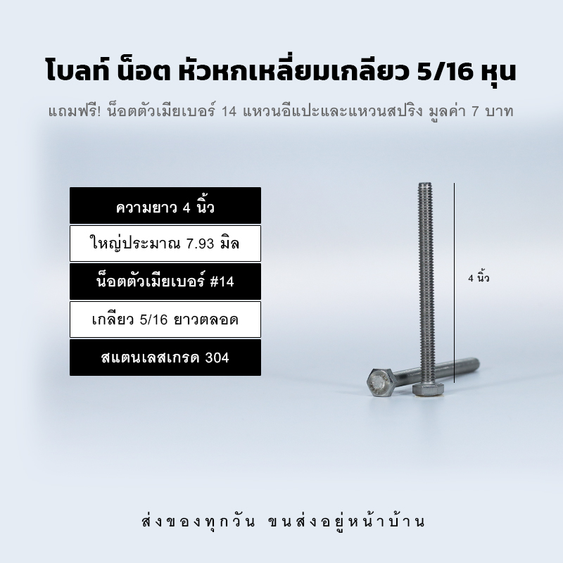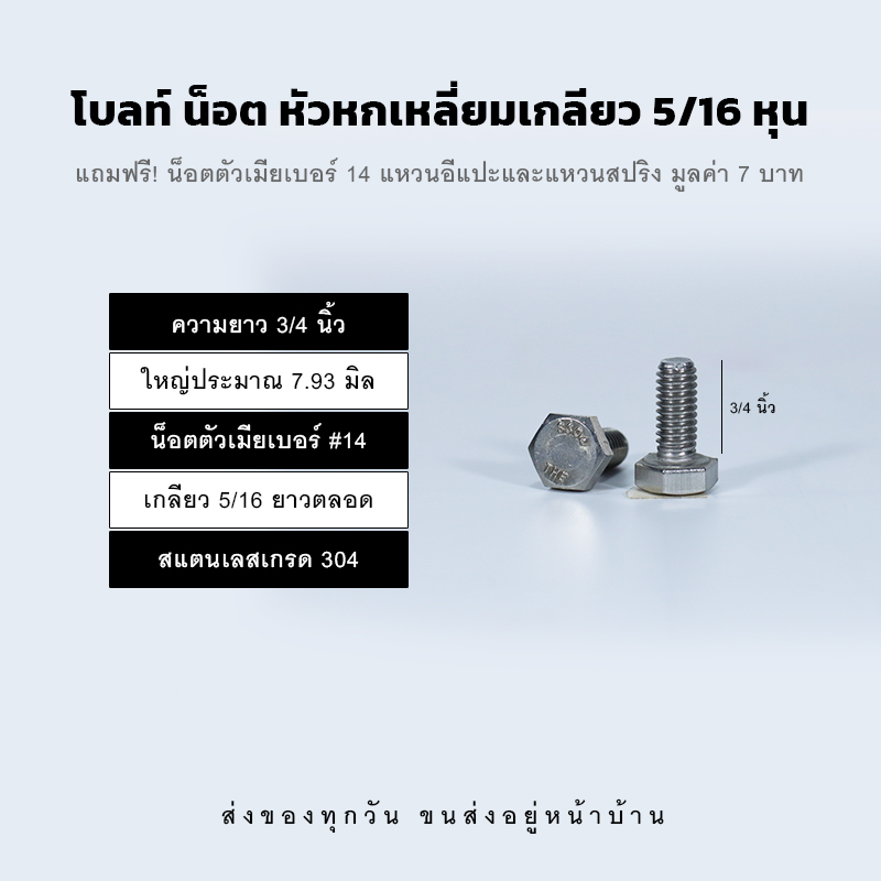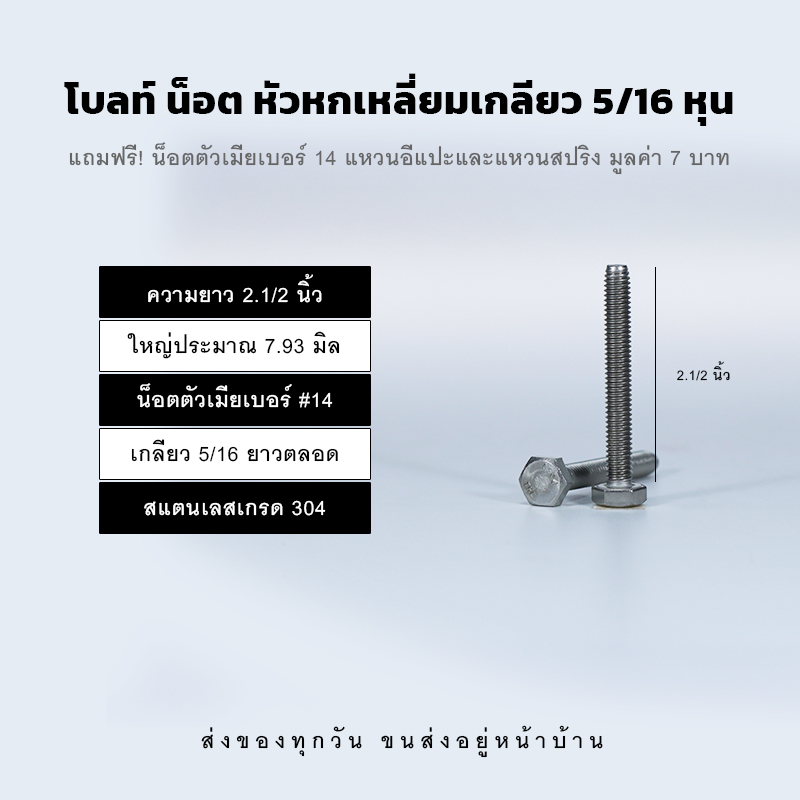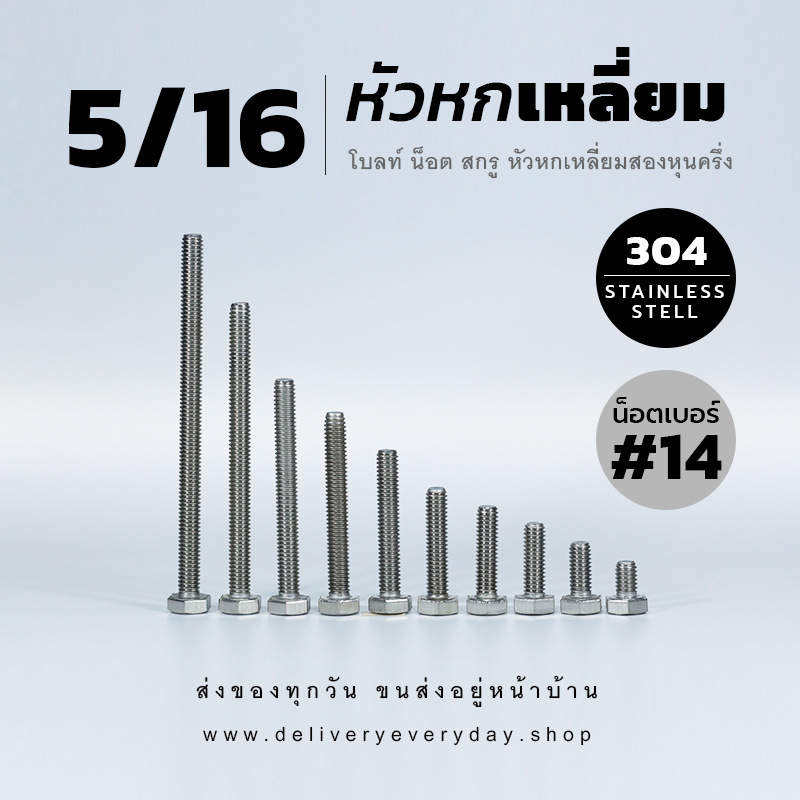โบลท์สองหุนครึ่ง 5/16 น็อตเบอร์ 14 ความยาวมีให้เลือกต้้งแต่ 1/2 นิ้ว – 5 นิ้ว สลักเกลียวใหญ่ประมาณ 7.93 มิล เกลียวยาวตลอด ผลิตจากสแตนเลสอย่างดีเกรด 304